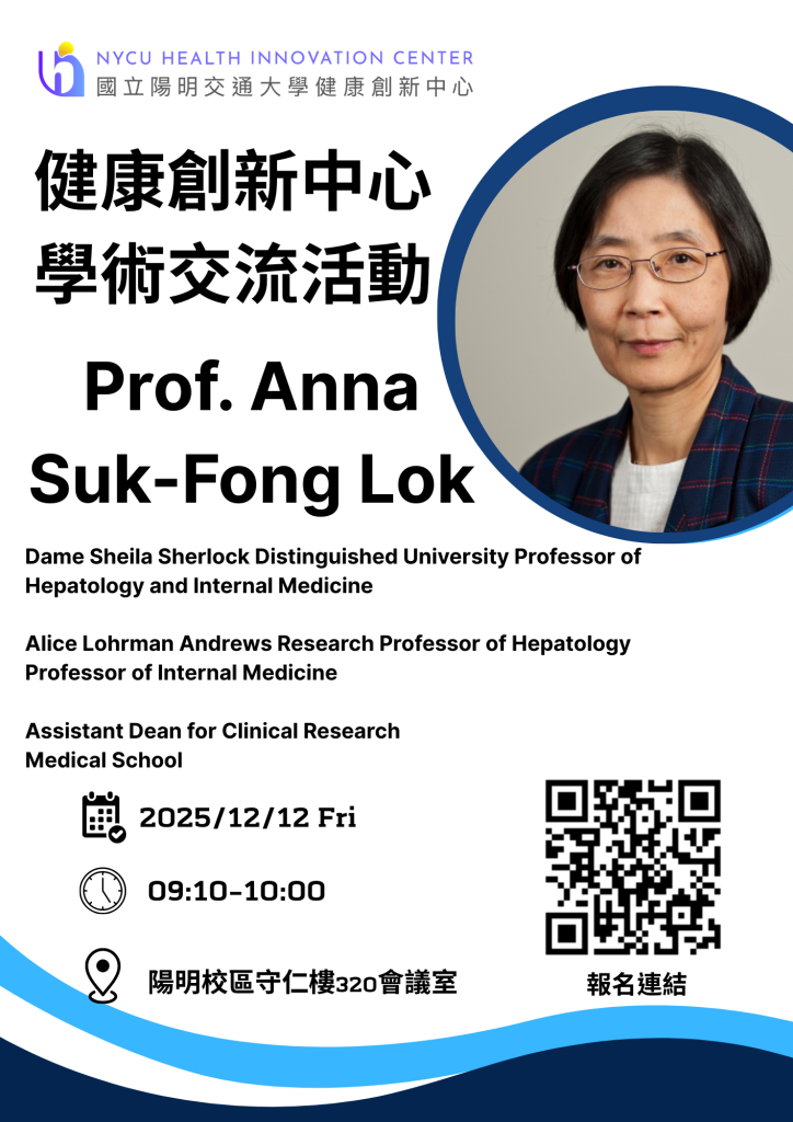 健康創新中心學術交流活動_Prof. Anna Suk-Fong Lokadmin2025 年 12 月 9 日活動公告 一、活動時間:2025/12/12(五)09:10-10:00二、活動地點:陽明校區守仁樓320會議室三、報名連結:https://forms.gle/iZNB1DedaNkPSkhi7