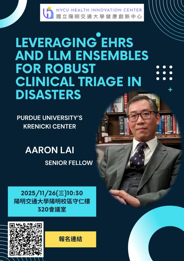 健康創新中心學術演講:Leveraging EHRs and LLM Ensembles for Robust Clinical Triage in Disastersadmin2025 年 10 月 8 日活動公告 【時間】:2025年11月26日(星期三) 上午10:30~12:00 【地點】:國立陽明交通大學守仁樓320會議室 【報名網址】:https://reurl.cc/0WrV9K